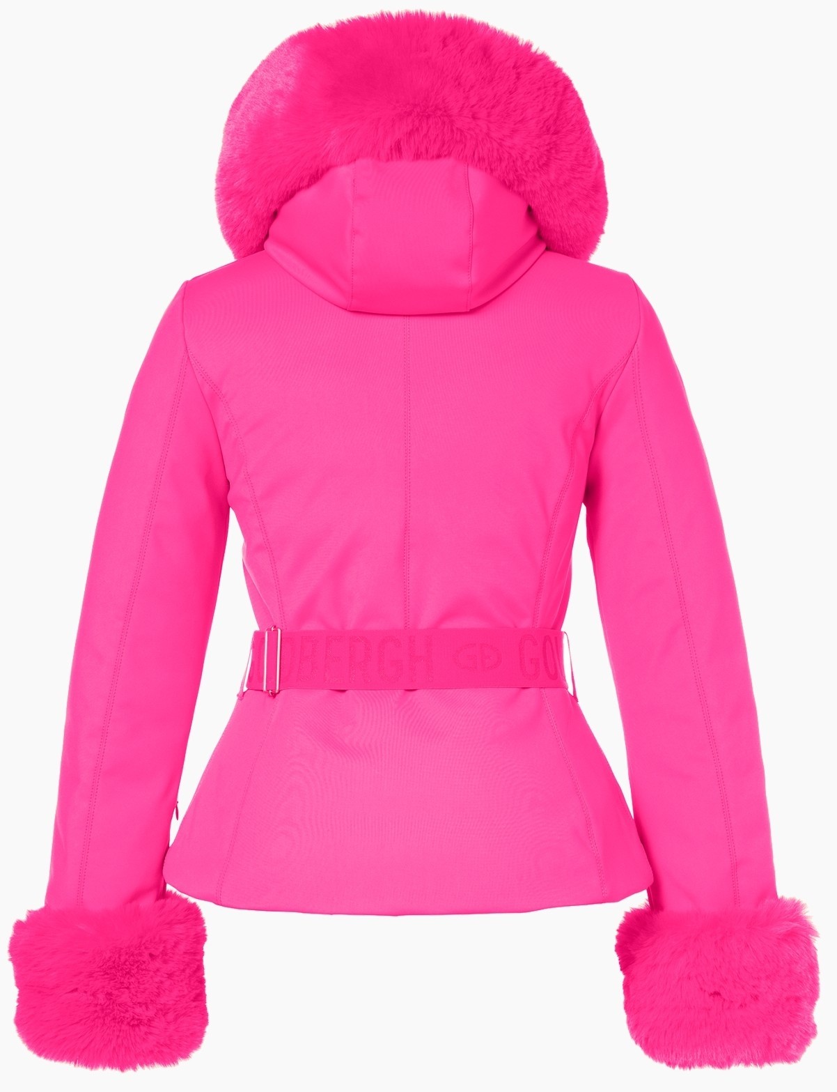 L'elegante giacca da sci Giselle ha una vestibilità PERFETTA. La cintura Goldbergh accentua la forma. Il cappuccio rimovibile ha un collo di pelliccia che è attaccato con bottoni automatici. All'interno, ci sono due tasche e una ghetta per la protezione dalla neve staccabile. Sulle maniche bordi in pelliccia staccabile per accentuare l'eleganza del design